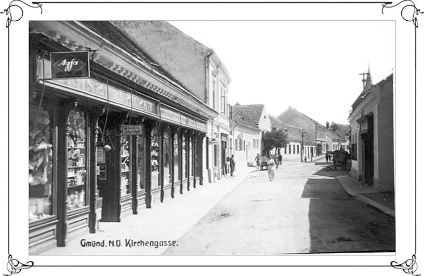 In der Kirchengasse (einst Untere oder Lange Gasse genannt) befanden sich seit alters her gegründete Gewerbe: Lederer, Lebzelter, Hafner und Kaufleute, der Meierhof und die Hofhäuser. Auch hier ist der Fortschritt eingezogen, wie diese Aufnahme aus dem Jahre 1932 beweist.